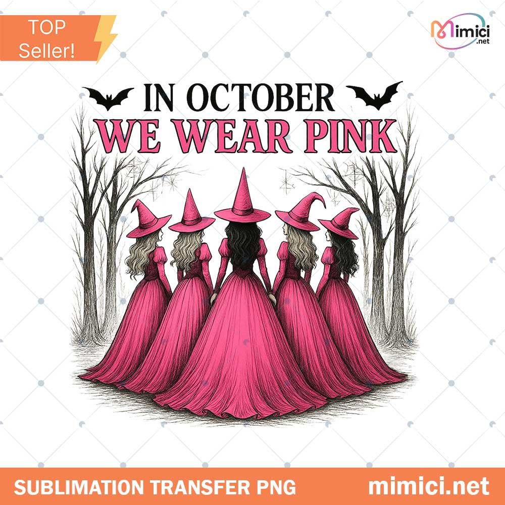 In October We Wear Pink PNG Png, Breast Cancer Awareness Png, Pink Halloween Witch Png, Retro Cancer Ribbon Png, Halloween Shirt Sublimation